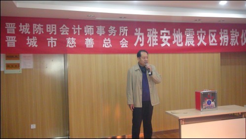 2013年4月28日下午三時(shí),陳明集團(tuán)會(huì)議室里愛(ài)意濃濃,正在舉行為雅安地震捐款獻(xiàn)愛(ài)心活動(dòng),此次捐款活動(dòng)我們有幸請(qǐng)到了晉城市慈善總會(huì)陳副會(huì)長(zhǎng)光臨并作了重要講話(huà),表示一定將陳明集團(tuán)全體員工的愛(ài)心送到雅安同胞手上。