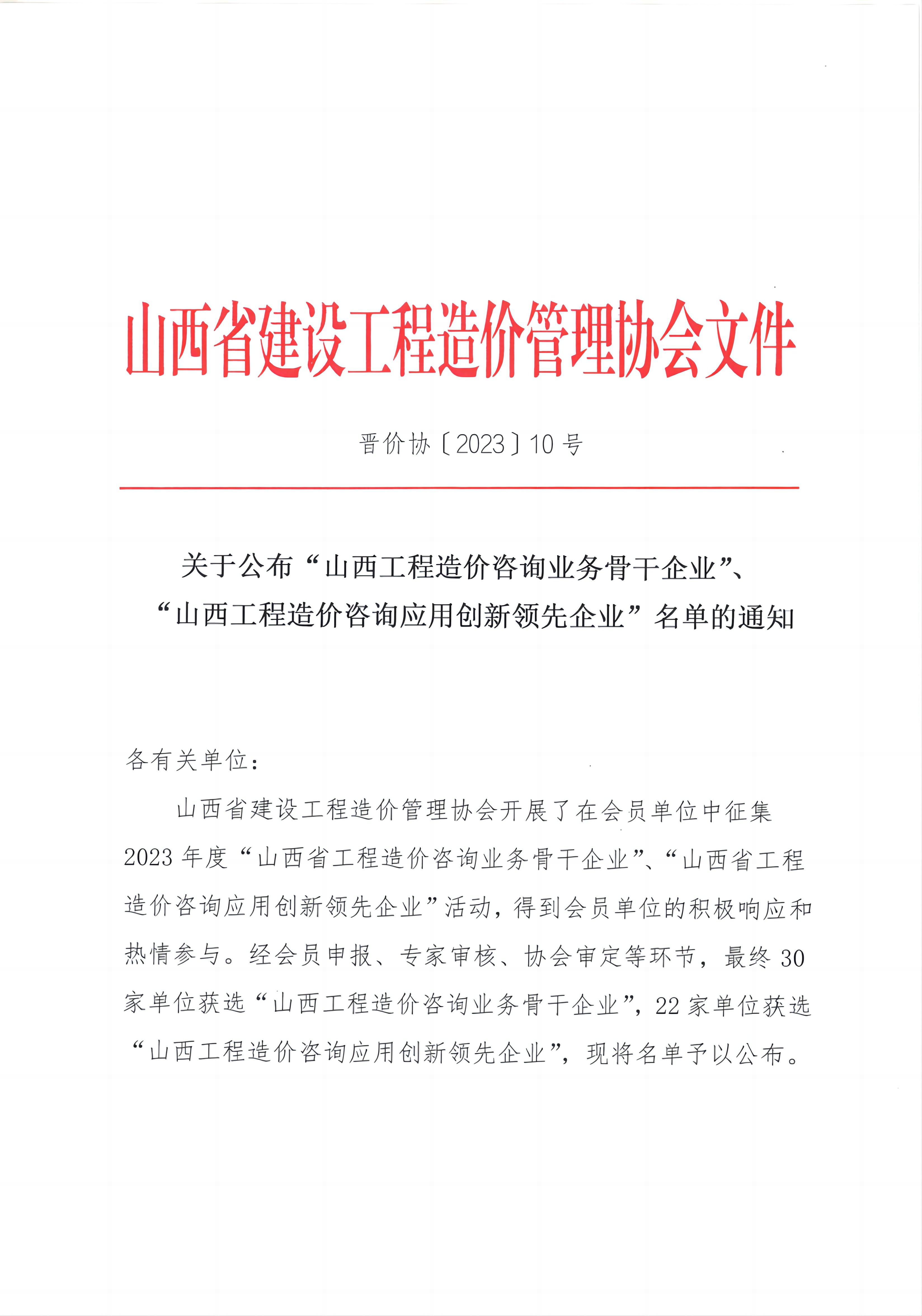 2023年,省價協(xié)開展2023年度“山西省工程造價咨詢業(yè)務(wù)骨干企業(yè)”、“山西省工程造價咨詢應(yīng)用創(chuàng)新領(lǐng)先企業(yè)"活動,我公司積極參與申報(bào),經(jīng)省價協(xié)初審、專家評審,最終,我公司入選2023年度“山西省工程造價咨詢業(yè)務(wù)骨干企業(yè)”。
